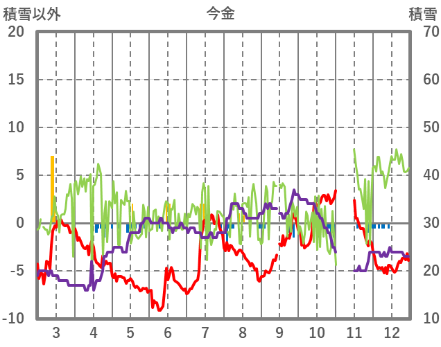 | 日 | 時 | 気温 | 降水 | 風向/風速 | 日照 | 積雪 | 降雪 |