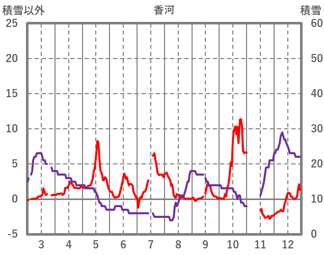 | 日 | 時 | 気温 | 降水 | 風向/風速 | 日照 | 積雪 | 降雪 |