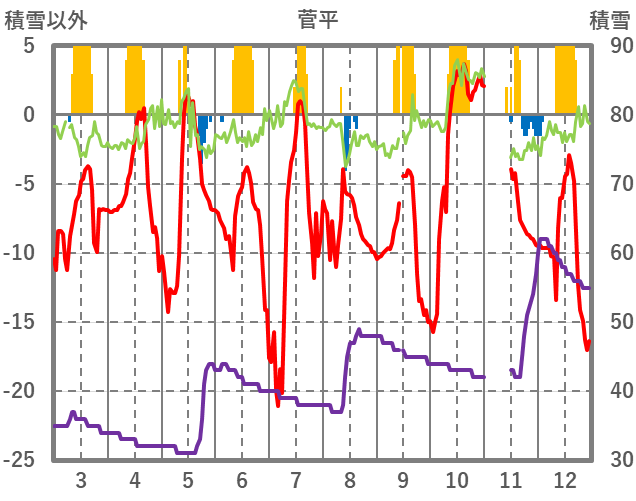| 日 | 時 | 気温 | 降水 | 風向/風速 | 日照 | 積雪 | 降雪 |