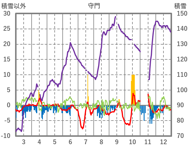 | 日 | 時 | 気温 | 降水 | 風向/風速 | 日照 | 積雪 | 降雪 |