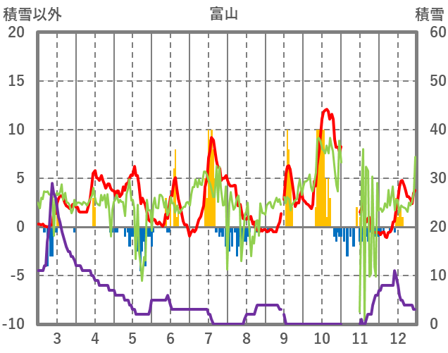 | 日 | 時 | 気温 | 降水 | 風向/風速 | 日照 | 積雪 | 降雪 |