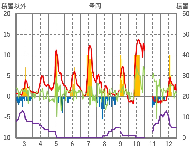 | 日 | 時 | 気温 | 降水 | 風向/風速 | 日照 | 積雪 | 降雪 |