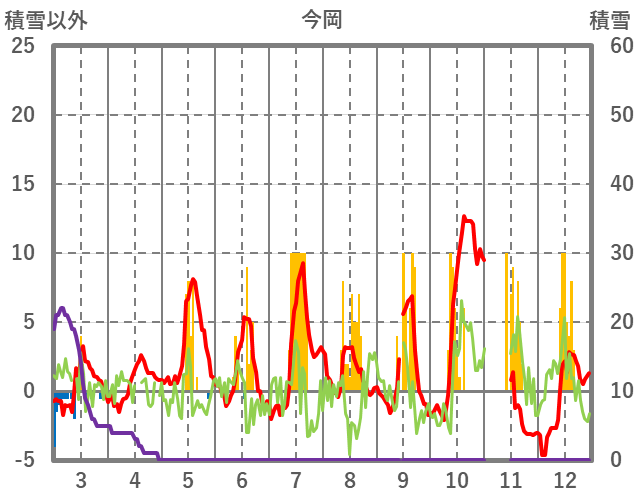 | 日 | 時 | 気温 | 降水 | 風向/風速 | 日照 | 積雪 | 降雪 |
