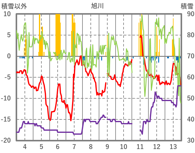 | 日 | 時 | 気温 | 降水 | 風向/風速 | 日照 | 積雪 | 降雪 |