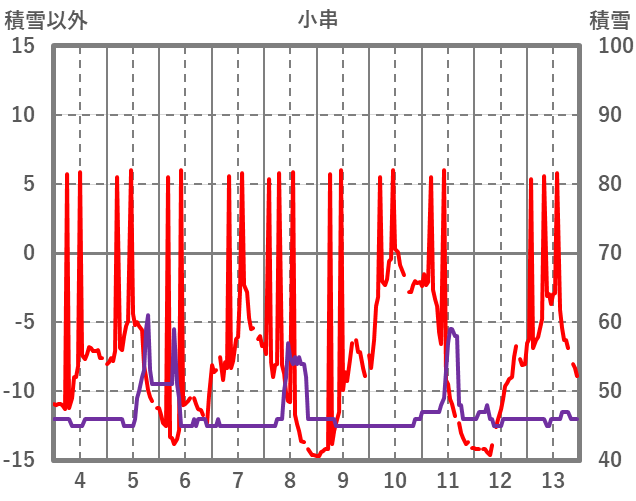 | 日 | 時 | 気温 | 降水 | 風向/風速 | 日照 | 積雪 | 降雪 |