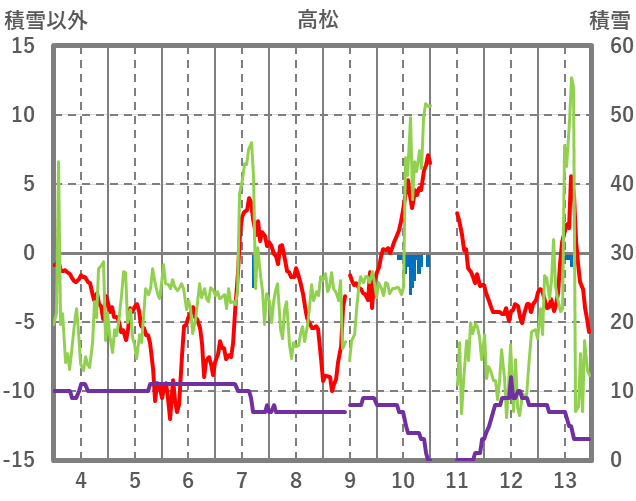 | 日 | 時 | 気温 | 降水 | 風向/風速 | 日照 | 積雪 | 降雪 |