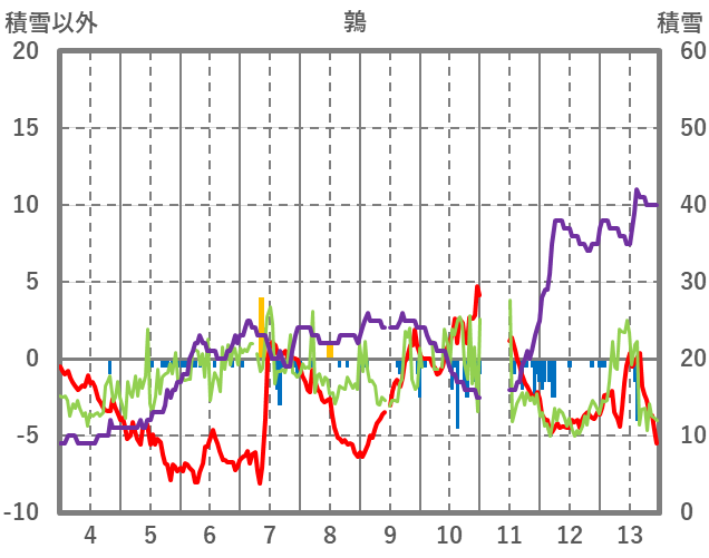 | 日 | 時 | 気温 | 降水 | 風向/風速 | 日照 | 積雪 | 降雪 |