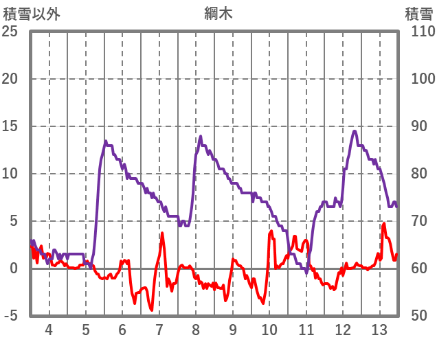 | 日 | 時 | 気温 | 降水 | 風向/風速 | 日照 | 積雪 | 降雪 |