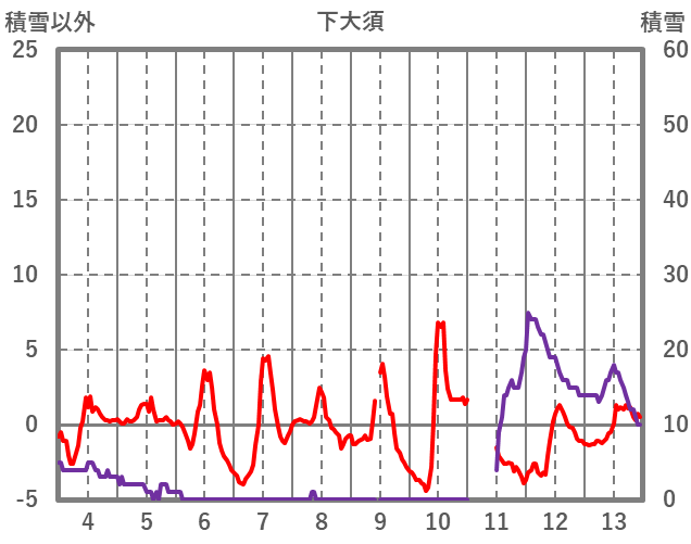 | 日 | 時 | 気温 | 降水 | 風向/風速 | 日照 | 積雪 | 降雪 |