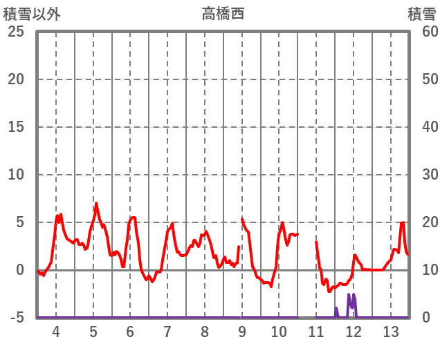 | 日 | 時 | 気温 | 降水 | 風向/風速 | 日照 | 積雪 | 降雪 |