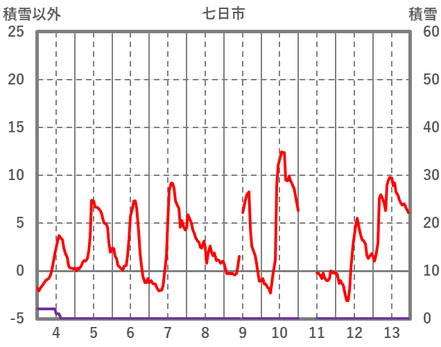 | 日 | 時 | 気温 | 降水 | 風向/風速 | 日照 | 積雪 | 降雪 |