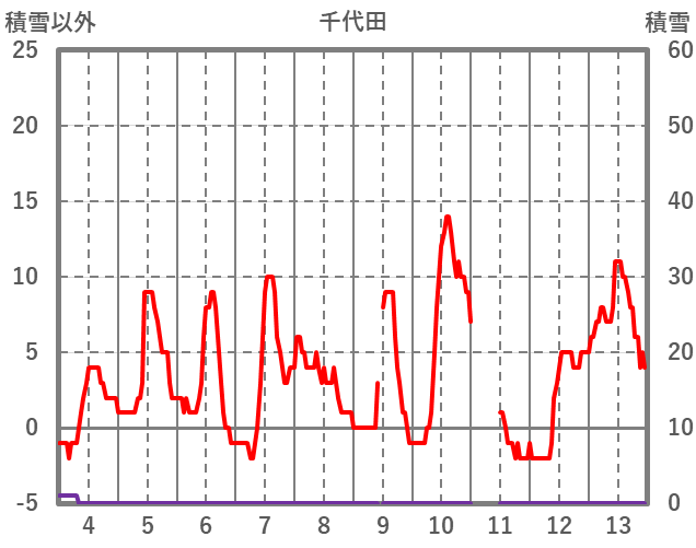| 日 | 時 | 気温 | 降水 | 風向/風速 | 日照 | 積雪 | 降雪 |