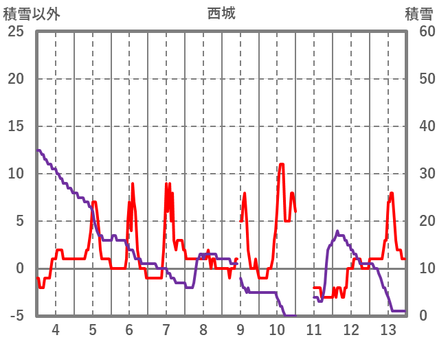 | 日 | 時 | 気温 | 降水 | 風向/風速 | 日照 | 積雪 | 降雪 |