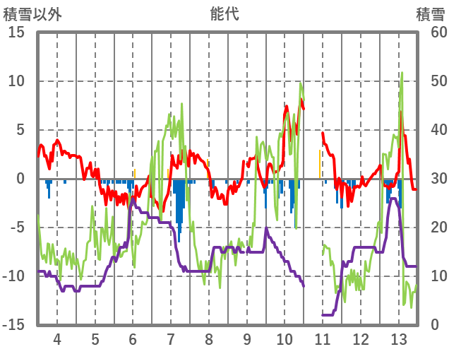 | 日 | 時 | 気温 | 降水 | 風向/風速 | 日照 | 積雪 | 降雪 |