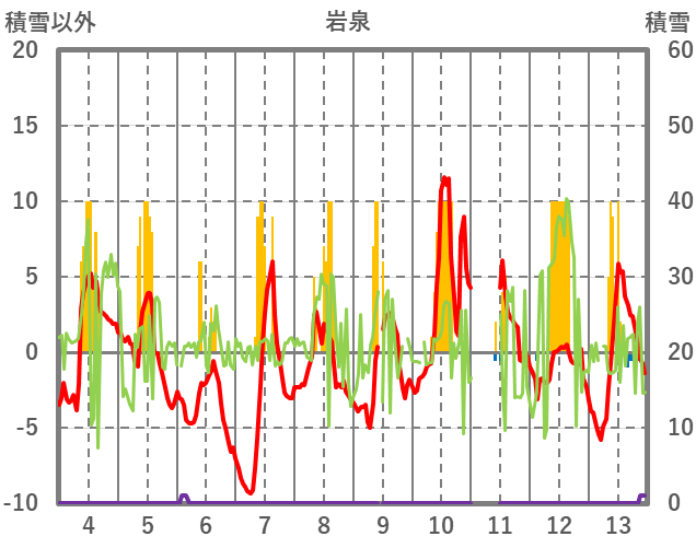 | 日 | 時 | 気温 | 降水 | 風向/風速 | 日照 | 積雪 | 降雪 |