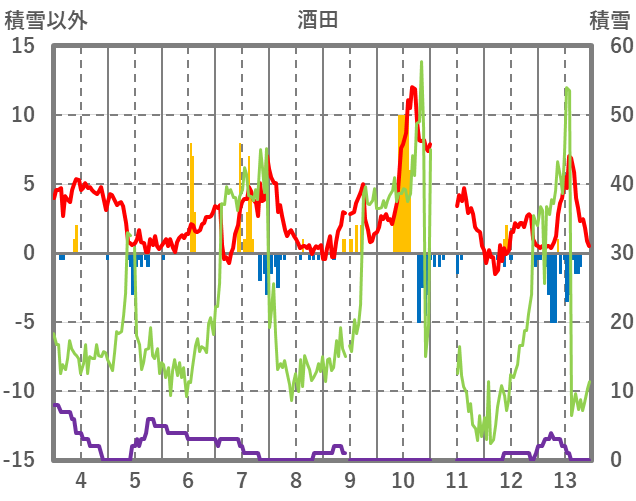 | 日 | 時 | 気温 | 降水 | 風向/風速 | 日照 | 積雪 | 降雪 |