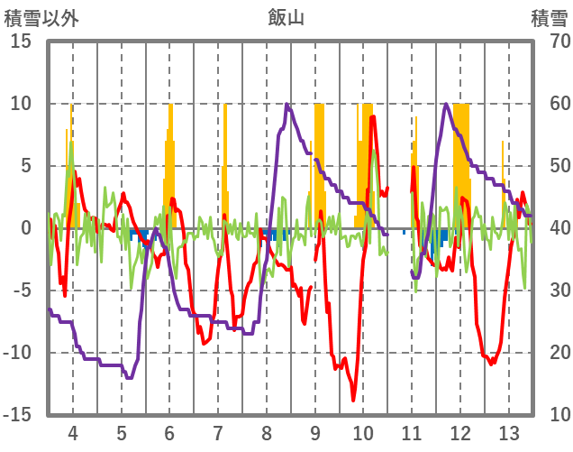 | 日 | 時 | 気温 | 降水 | 風向/風速 | 日照 | 積雪 | 降雪 |