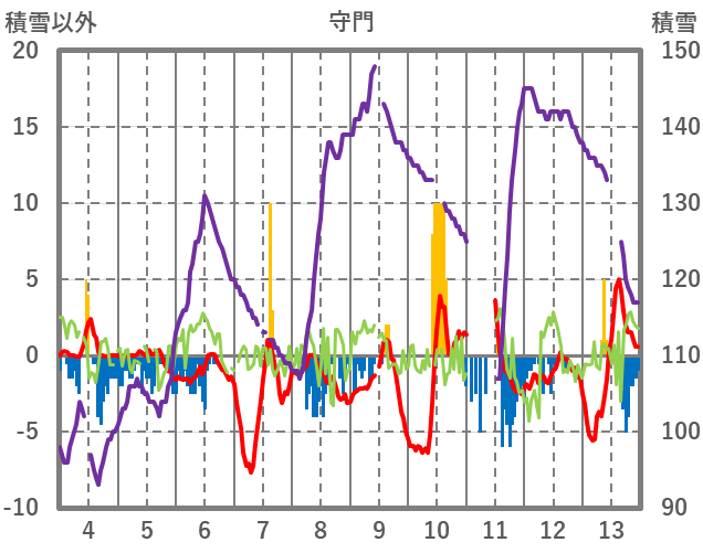 | 日 | 時 | 気温 | 降水 | 風向/風速 | 日照 | 積雪 | 降雪 |