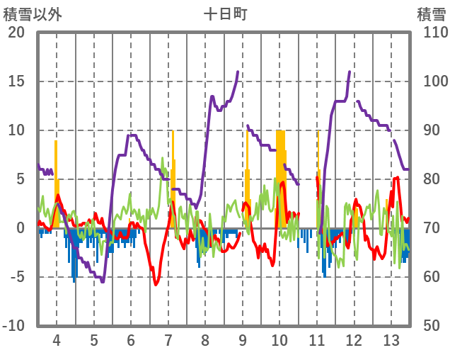 | 日 | 時 | 気温 | 降水 | 風向/風速 | 日照 | 積雪 | 降雪 |