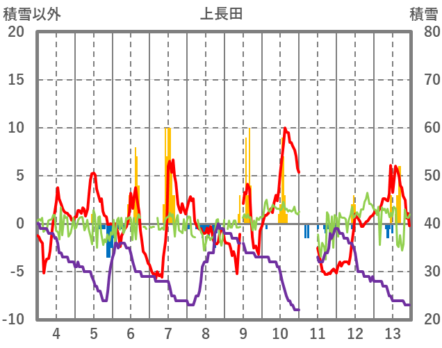 | 日 | 時 | 気温 | 降水 | 風向/風速 | 日照 | 積雪 | 降雪 |