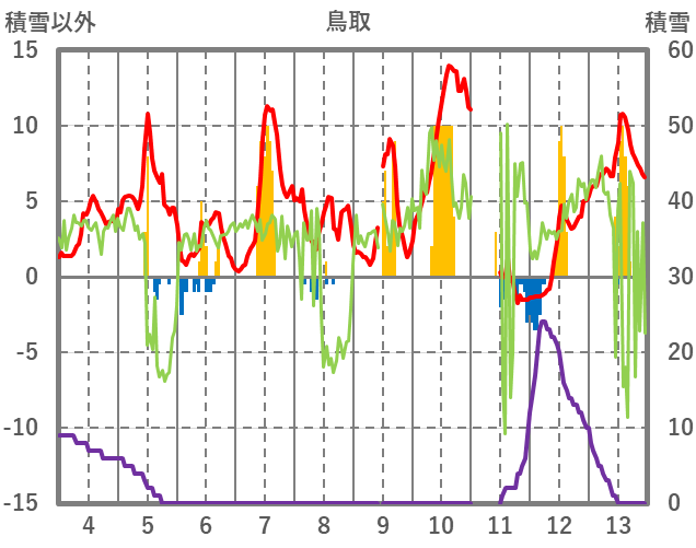 | 日 | 時 | 気温 | 降水 | 風向/風速 | 日照 | 積雪 | 降雪 |