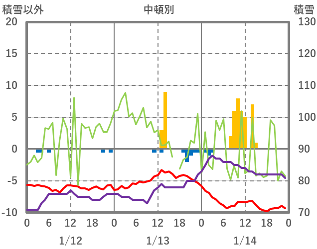 | 日 | 時 | 気温 | 降水 | 風向/風速 | 日照 | 積雪 | 降雪 |