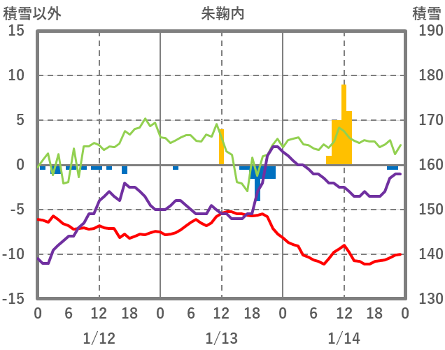 | 日 | 時 | 気温 | 降水 | 風向/風速 | 日照 | 積雪 | 降雪 |