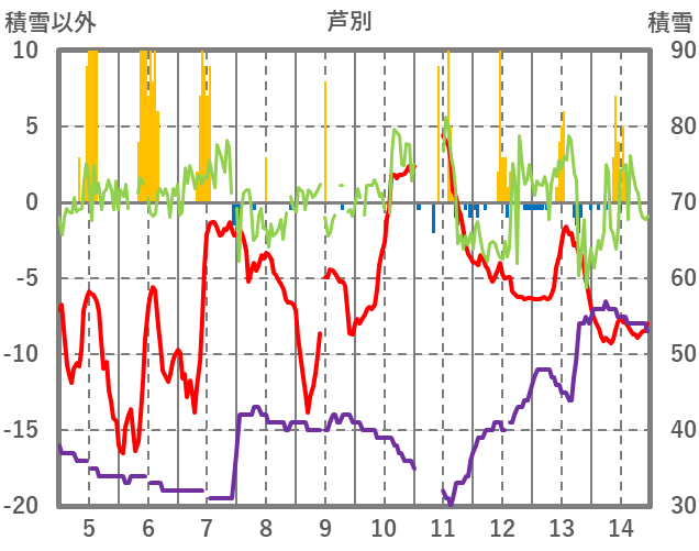 | 日 | 時 | 気温 | 降水 | 風向/風速 | 日照 | 積雪 | 降雪 |