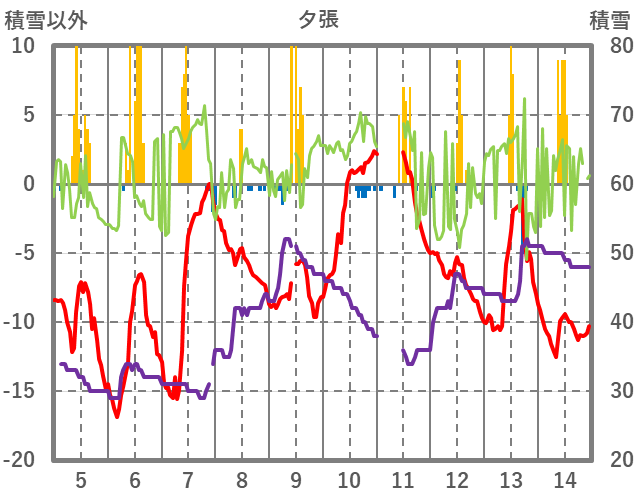 | 日 | 時 | 気温 | 降水 | 風向/風速 | 日照 | 積雪 | 降雪 |