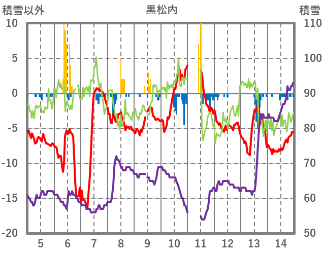 | 日 | 時 | 気温 | 降水 | 風向/風速 | 日照 | 積雪 | 降雪 |