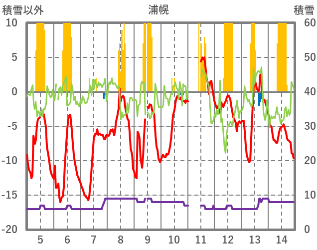 | 日 | 時 | 気温 | 降水 | 風向/風速 | 日照 | 積雪 | 降雪 |