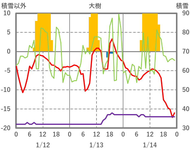 | 日 | 時 | 気温 | 降水 | 風向/風速 | 日照 | 積雪 | 降雪 |