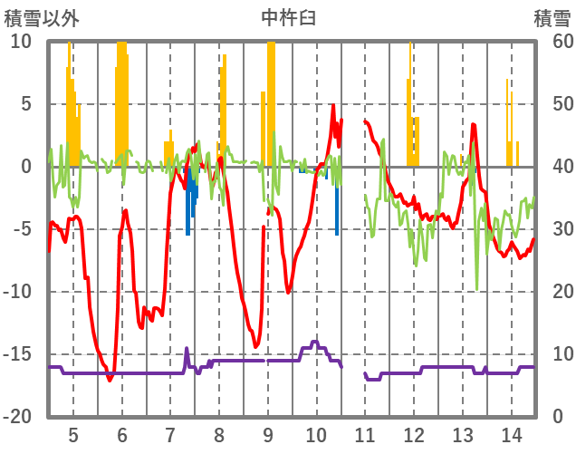 | 日 | 時 | 気温 | 降水 | 風向/風速 | 日照 | 積雪 | 降雪 |