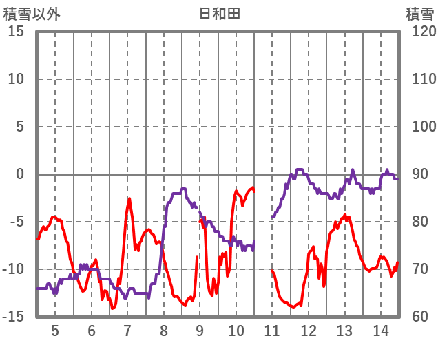 | 日 | 時 | 気温 | 降水 | 風向/風速 | 日照 | 積雪 | 降雪 |