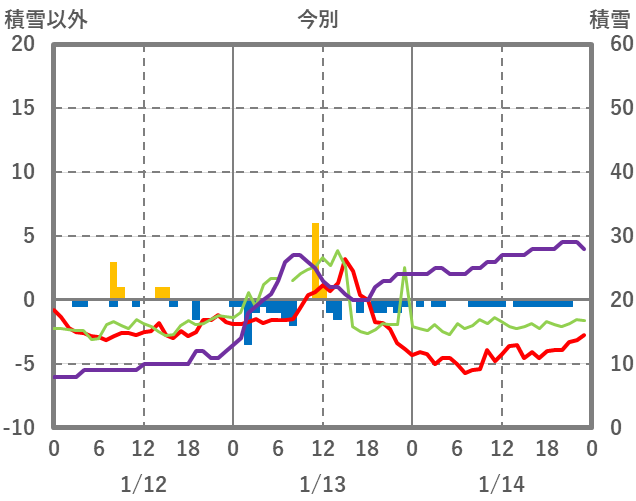 | 日 | 時 | 気温 | 降水 | 風向/風速 | 日照 | 積雪 | 降雪 |