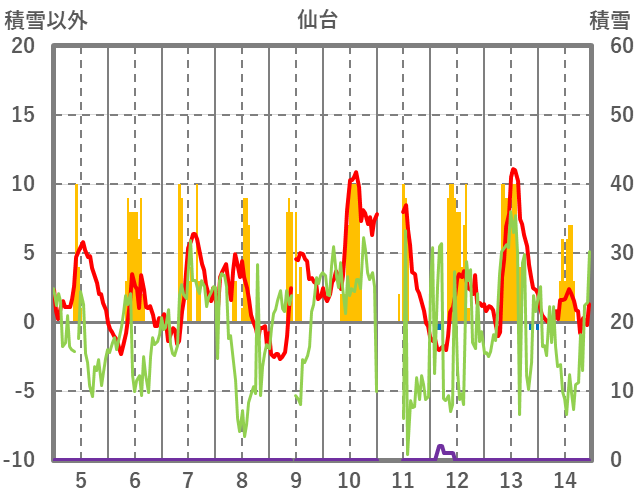 | 日 | 時 | 気温 | 降水 | 風向/風速 | 日照 | 積雪 | 降雪 |