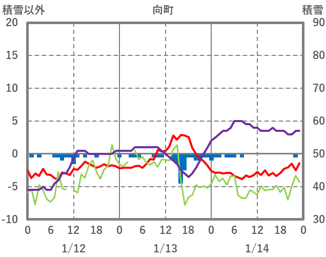 | 日 | 時 | 気温 | 降水 | 風向/風速 | 日照 | 積雪 | 降雪 |