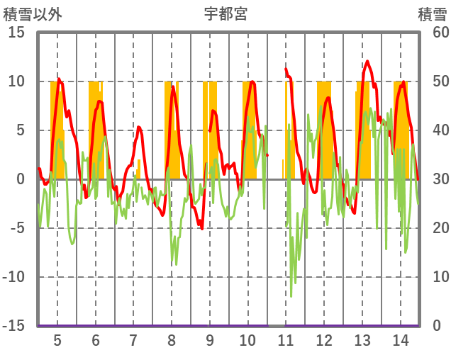 | 日 | 時 | 気温 | 降水 | 風向/風速 | 日照 | 積雪 | 降雪 |