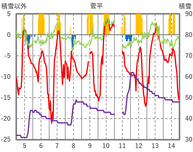 | 日 | 時 | 気温 | 降水 | 風向/風速 | 日照 | 積雪 | 降雪 |