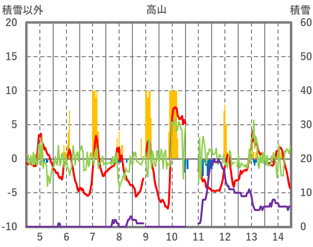 | 日 | 時 | 気温 | 降水 | 風向/風速 | 日照 | 積雪 | 降雪 |