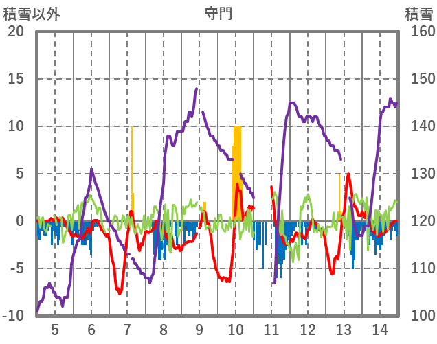 | 日 | 時 | 気温 | 降水 | 風向/風速 | 日照 | 積雪 | 降雪 |