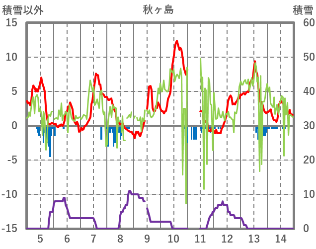 | 日 | 時 | 気温 | 降水 | 風向/風速 | 日照 | 積雪 | 降雪 |