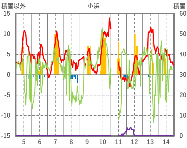 | 日 | 時 | 気温 | 降水 | 風向/風速 | 日照 | 積雪 | 降雪 |