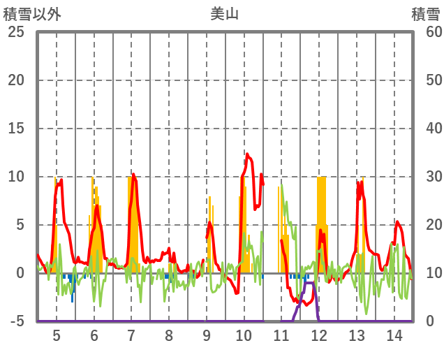 | 日 | 時 | 気温 | 降水 | 風向/風速 | 日照 | 積雪 | 降雪 |