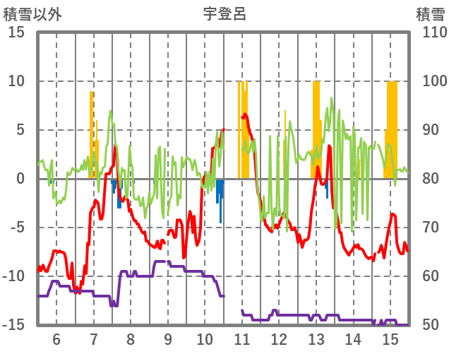 | 日 | 時 | 気温 | 降水 | 風向/風速 | 日照 | 積雪 | 降雪 |