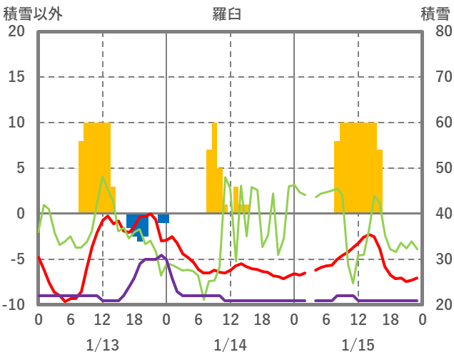 | 日 | 時 | 気温 | 降水 | 風向/風速 | 日照 | 積雪 | 降雪 |