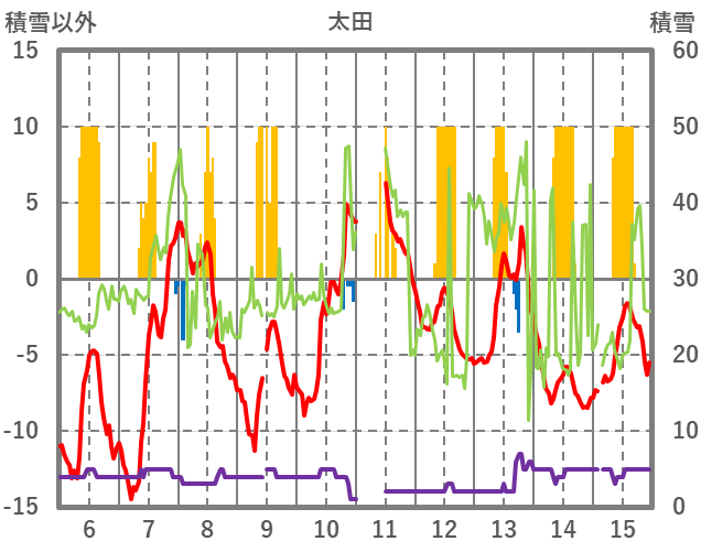 | 日 | 時 | 気温 | 降水 | 風向/風速 | 日照 | 積雪 | 降雪 |
