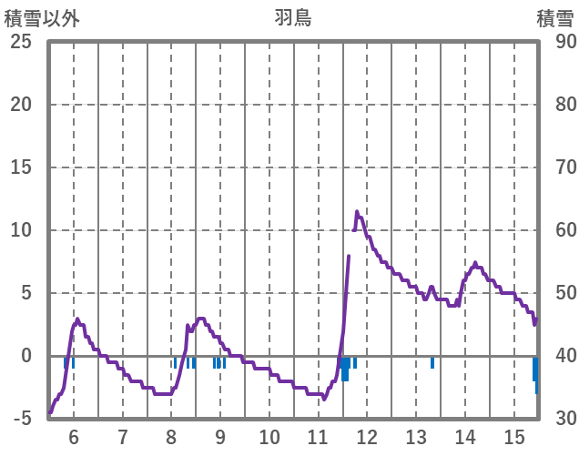 | 日 | 時 | 気温 | 降水 | 風向/風速 | 日照 | 積雪 | 降雪 |