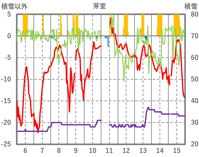 | 日 | 時 | 気温 | 降水 | 風向/風速 | 日照 | 積雪 | 降雪 |