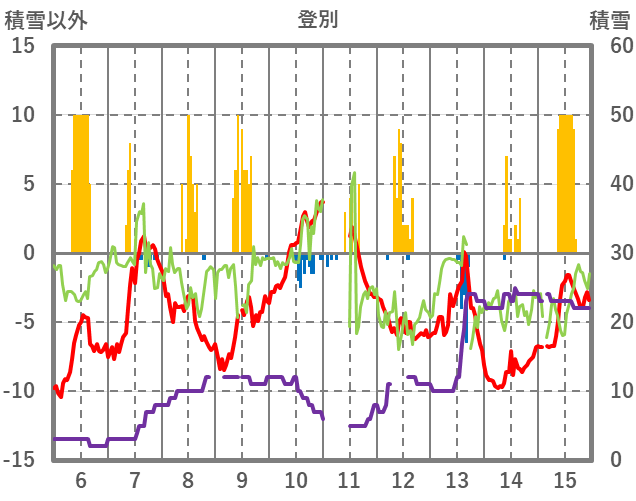| 日 | 時 | 気温 | 降水 | 風向/風速 | 日照 | 積雪 | 降雪 |